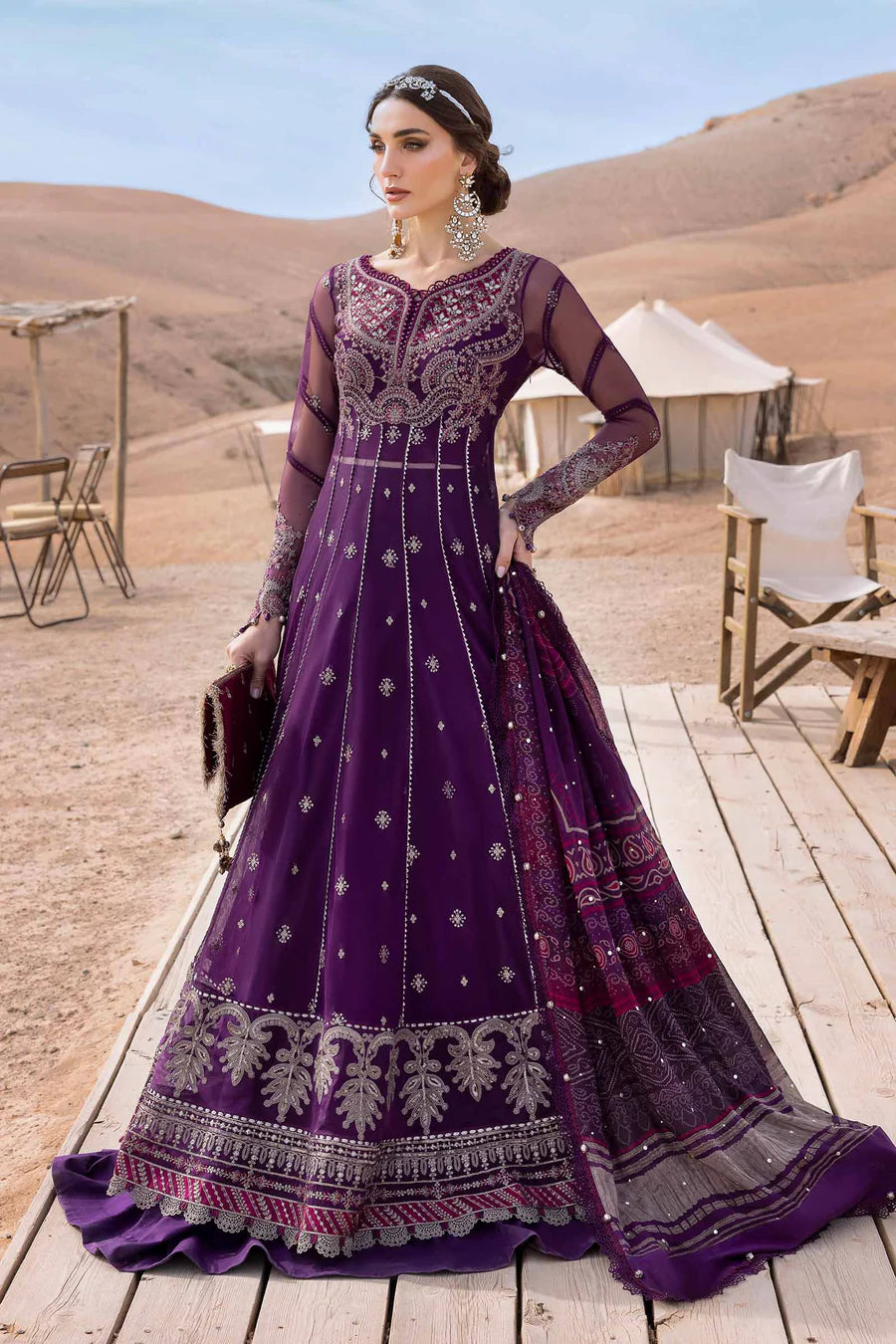 Shirt Embroidered Organza Neck Patch Embroidered Net Bodice Front Embroidered Net Front Embroidered Organza Ghera Patti Front Embroidered Organza Ghera Patti Back Embroidered Net Sleeves Embroidered Organza Sleeves Patch Paste Printed Net Back Fabric: Net Color: Plum Undershirt Dyed Undershirt Fabric: Lawn Color: Plum Trousers Dyed Trouser Fabric: Cambric Color: Plum Dupatta Printed Dupatta With Mukaish Fabric: Medium Silk Color: Plum Note: Dry Clean Only